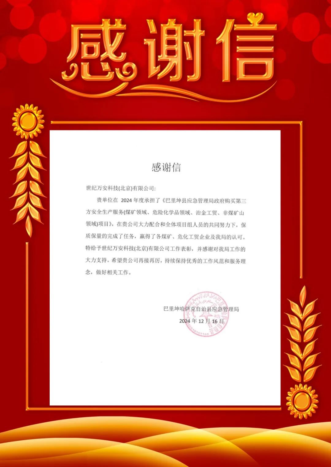 世紀萬安公司助力巴里坤縣安全生產(chǎn)提升 應(yīng)急管理局致函感謝